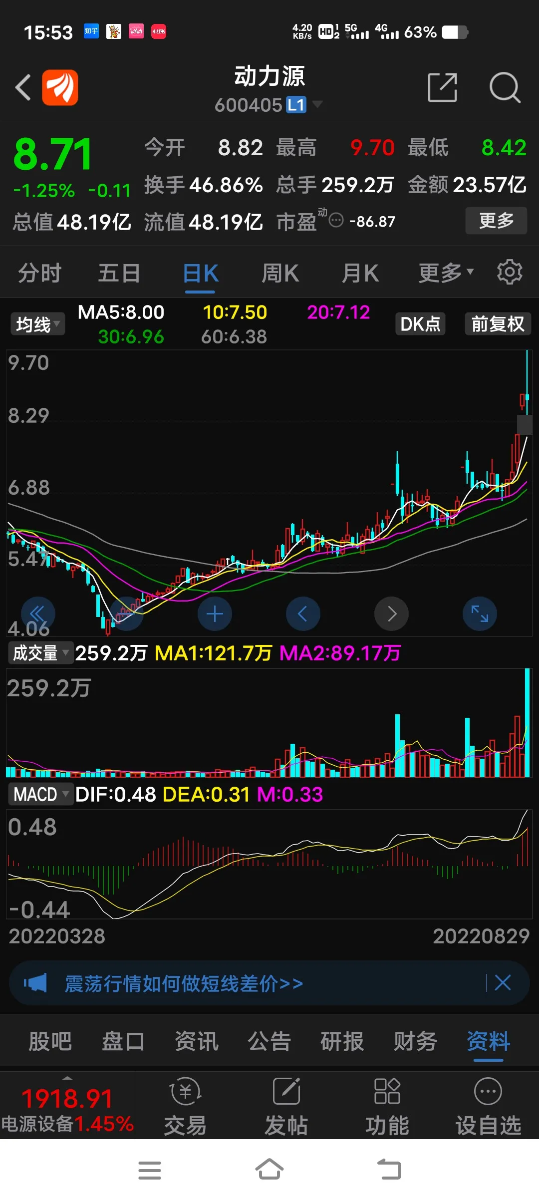 今日早盘以3.82元卖出剩余一手,本想尾盘低吸买回的,却午后大涨一波,错失许多盈利,看来有时是不能随便做T的。
