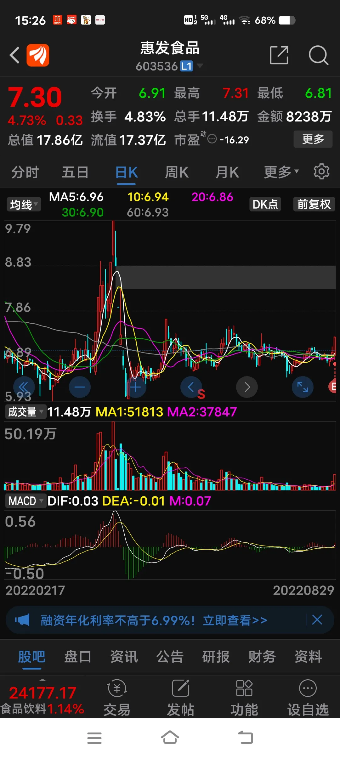 1.惠发食品:早盘先是以6.88元建仓,尾盘又以7.24元加仓,总持仓近三成,成本7.02元,浮盈3.9%。