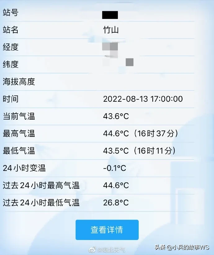 44.3℃,已刷新湖北最高气温历史纪录。而13号,竹山再创新高,44.6℃!”。