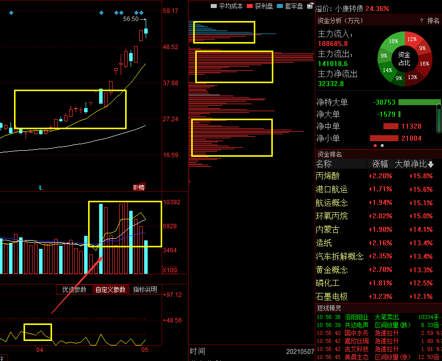 筹码分布:它的筹码多集中于加速后的震荡阶段,说明里面的筹码也是偏向于低吸,不想追高,那么这样的架构,它强势的时候各方相安甚好,但是它一旦连续整理就容易合力的泄气,关键防御线是10天线。