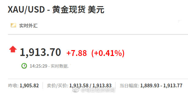 14:25 现货黄金站上1913美元/盎司,涨0.41%;现货白银收复24美元/盎司关口,日内涨逾1%。