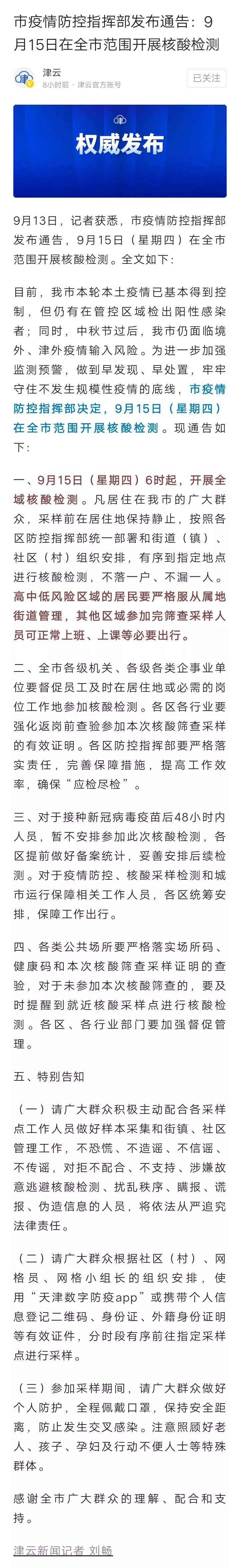 本轮本土疫情已基本得到控制,但仍有在管控区域检出阳性感染者;同时,中秋节过后,天津市仍面临境外、津外疫情输入风险。9月15日(星期四)6时起,开展全域核酸检测。