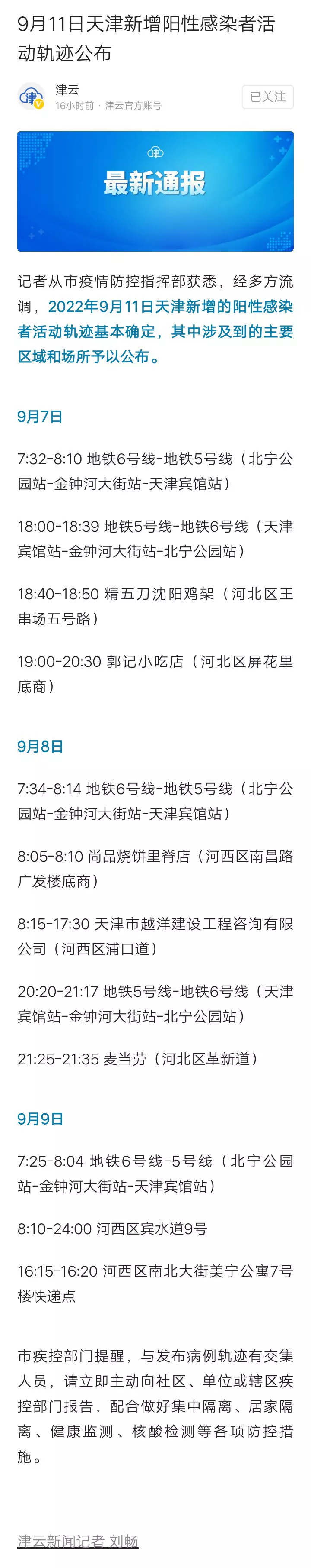 9月11日天津新增的阳性感染者活动轨迹基本确定,其中涉及到的主要区域和场所予以公布。