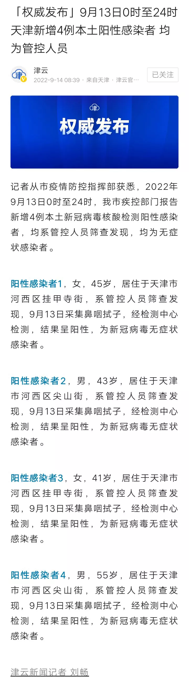 [玫瑰]天津市新增4例本土新冠病毒核酸检测阳性感染者,均系管控人员筛查发现,均为无症状感染者。