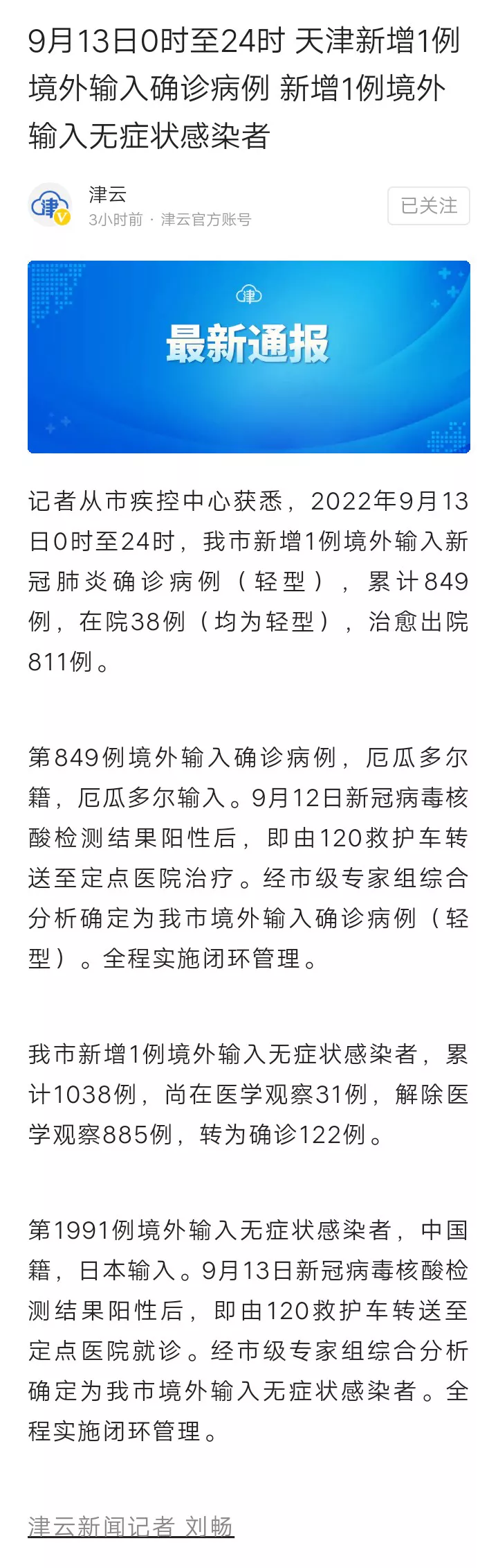 天津新增1例境外输入确诊病例,新增1例境外输入无症状感染者,在院38例(均为轻型)。