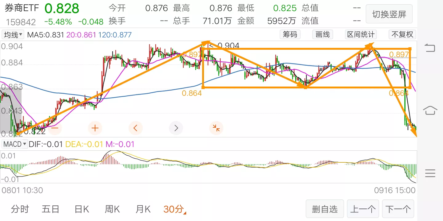 30分图。5分2卖己出,基本上会30分回调一笔,支撑图中低点,能形成支撑反弹一笔再看图中高点,这时谨防日线下跌中枢完成,反手走向下离开段。当然这是后话,先看目前这笔回调,有做5分中枢下跌的可能,5分压力与支撑就是图中框框。阶中枢完成后向上乏力,反手加速下跌。