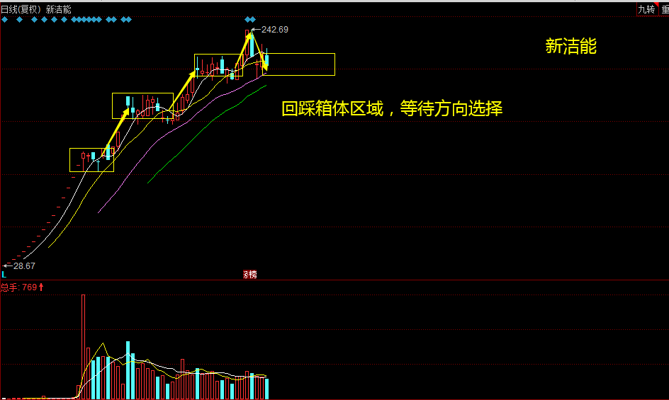 新洁能,属于近期半导体里面走势最强的次新+优质的几个半导体之一。前期的表现很强势,有过一段恐慌的抛盘,之后再次被拉回上升趋势。虽然有调整,但是属于回踩的类型。
