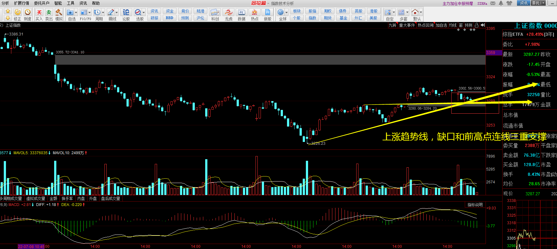 今日大盘指数迎来调整,目前在十五分钟上涨趋势线附近窄幅震荡,午后留意是否回补昨日跳空低开的缺口,分时图上黄线在上,白线在下,或可考虑继续去挖掘题材低位补涨的机会。