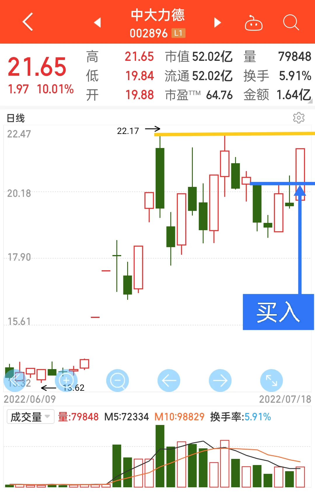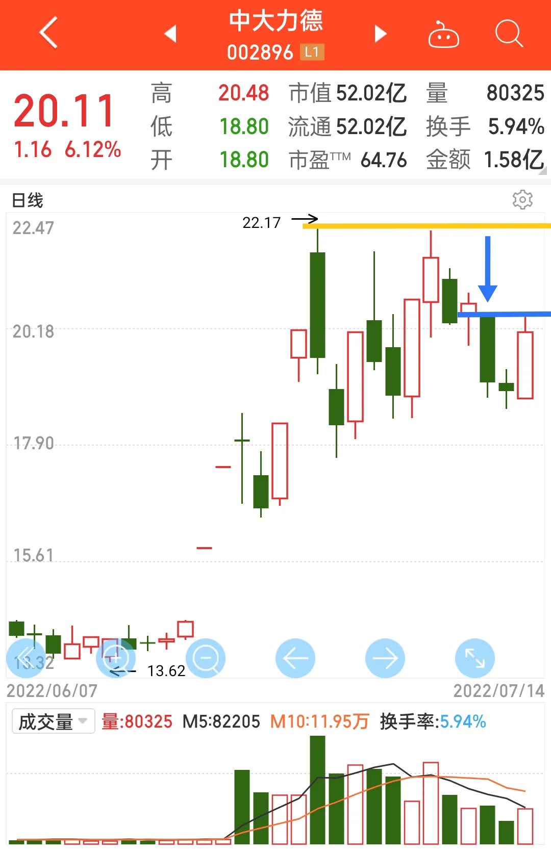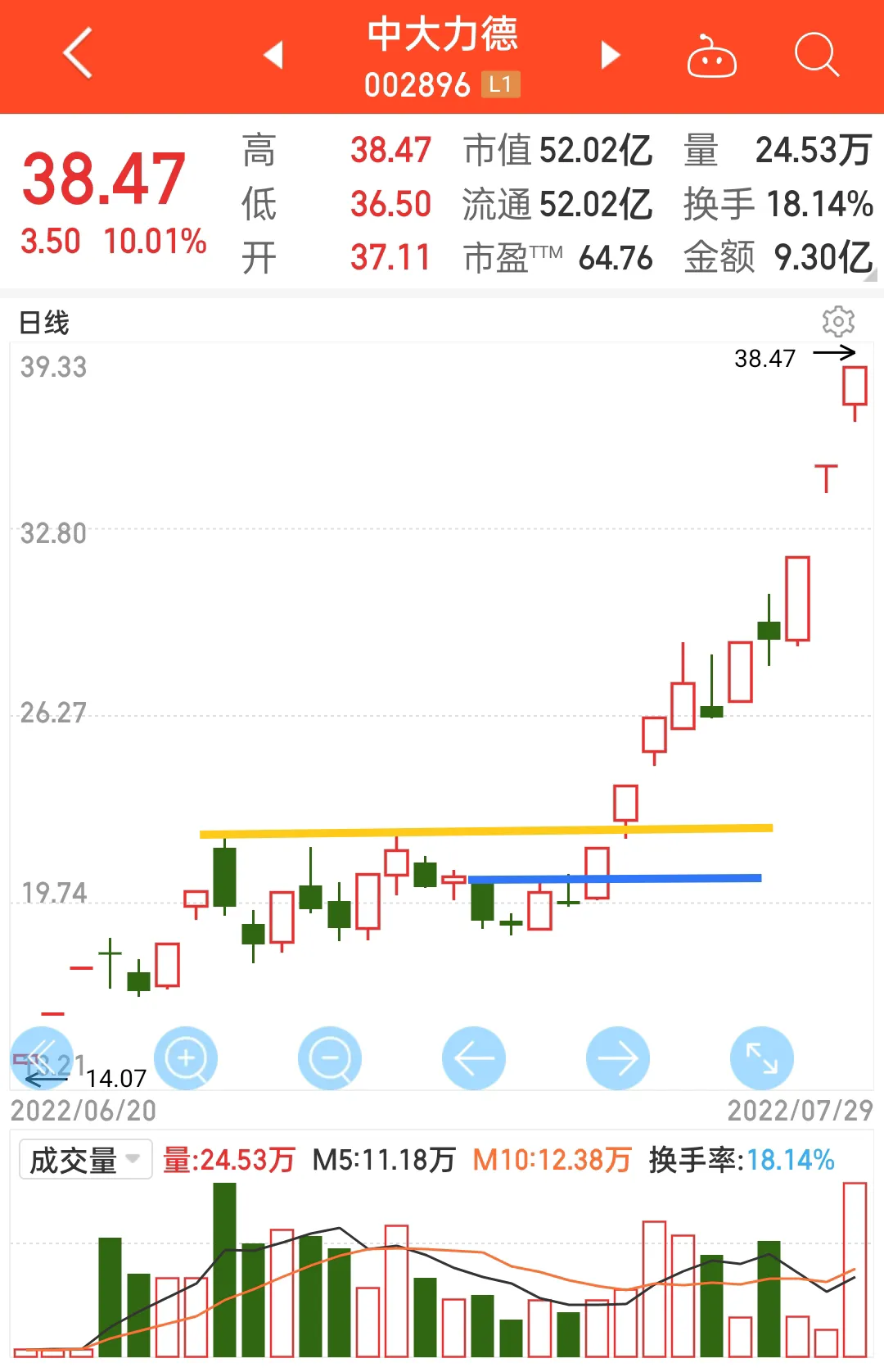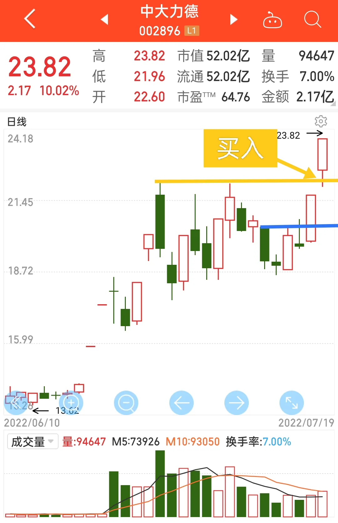 嗯?这个中大力德,走出底分型,将突破未突破!于是你画了一条蓝线。你知道这条蓝线对你来说,就是冲锋号。