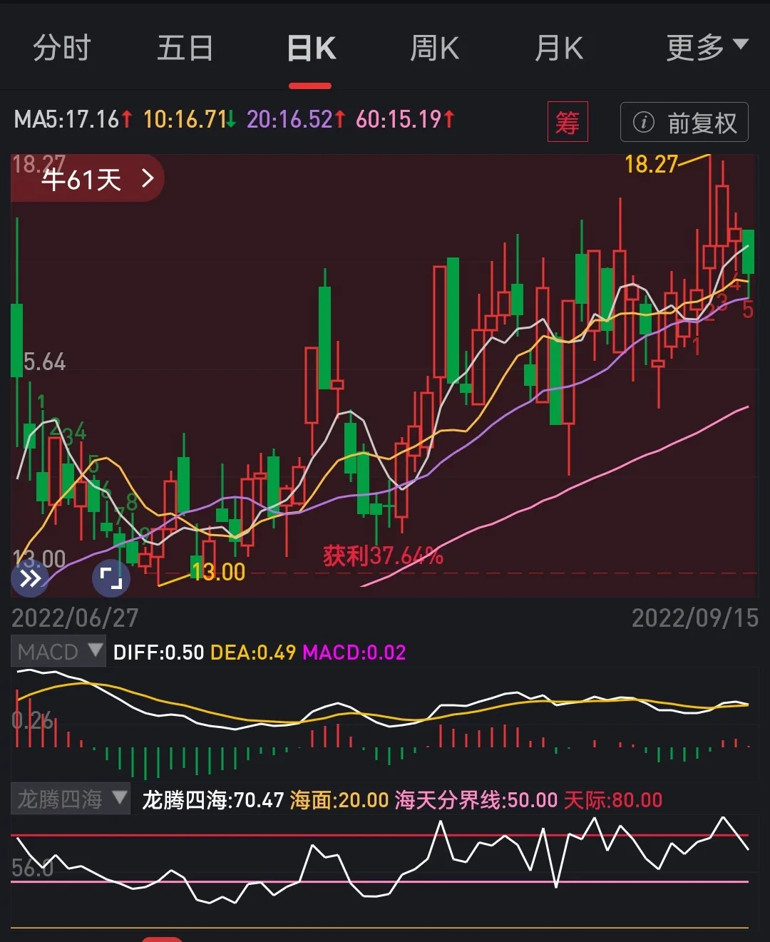 分界线上方,整体属于上升趋势强势股,短期缩量回踩,激进者考虑逢低博反弹,短线跌破15.17考虑止损,稳健者建议休息,供参考。供参考!备注:1、个股仅做学习参考,不做买卖依据,据此操作盈亏自负!2、短线个股需要设置好止损,单票不宜重仓!