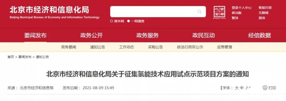 2021年8月9日,北京市经济和信息局发布了《北京市经济和信息化局关于征集氢能技术应用试点示范项目方案的通知》(简称《通知》)。