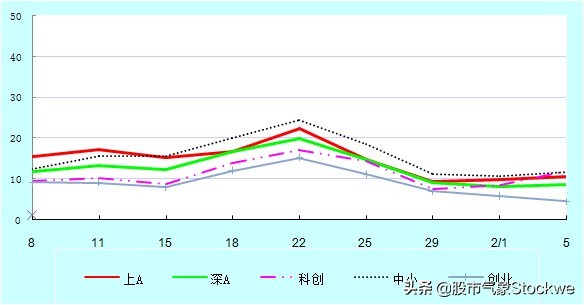一周股市气温有升有降。科创板,上海A股和中小板气温有所上升,深圳A股和创业板气温有所下降。上海A股,科创板雨转阴,中小板阴,深圳A股和创业板雨。强弱排序有变化:中小板,科创板,上A,深A,创业板。