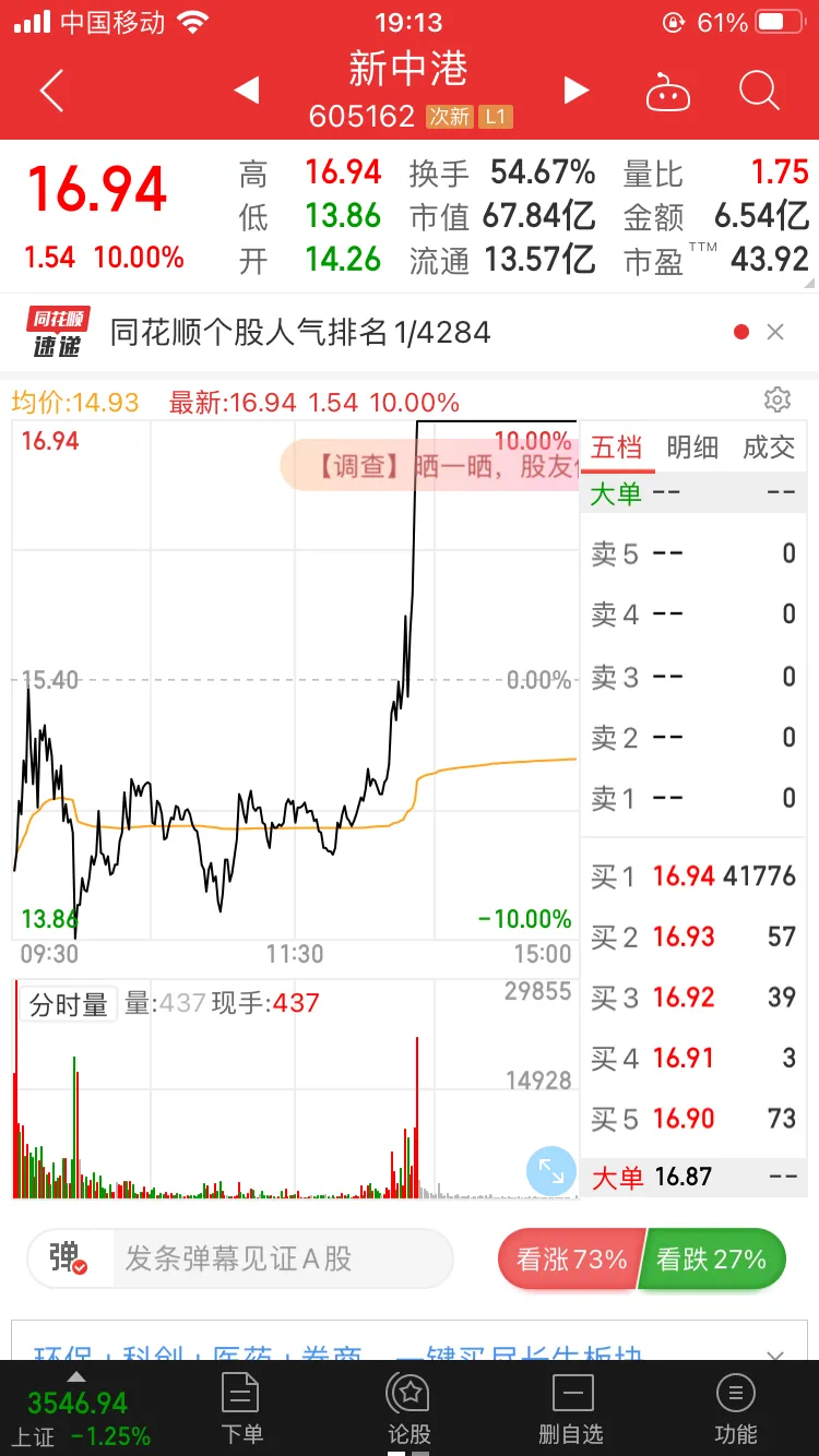 下午闽东电力回封后605162新中港地天板,这个板就是游资大佬的厉害之处,因为电力板块没有板块效应,闽东电力独木难支走不远,有板块个股助攻龙头更强,新中港拉板我就知道闽东不开板安全了,明天大肉。新中港这种就是临时起意板,没有闽东的涨停它今天也就在水下潜水,所以很多票是情绪票,不是说看好就会涨,跟环境有关。