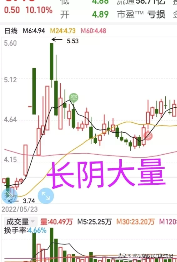 6、‘绿肥红瘦’长阴线放大量的K线形态不做,阴线很长,量能很大,说明空方占优势!也可能是主力吸筹还不多,还在洗盘阶段!