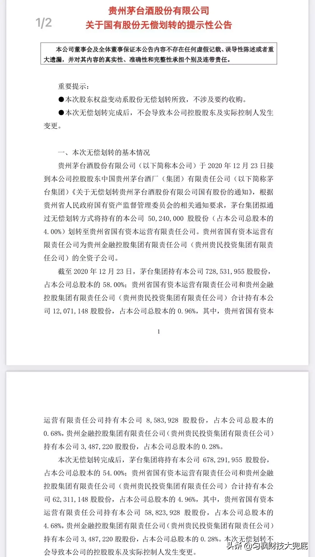 #贵州茅台:国有股份无偿划转#从头条热榜上看到,茅台集团在今年又一次以无偿划转的方式,将4%的股份划转至贵州省国有资产运营有限责任公司。虽然这两者都是国资控股公司,无偿划转不存在关联交易,但还是引发了投资者的关注,贵州茅台股价收了一条阴线。