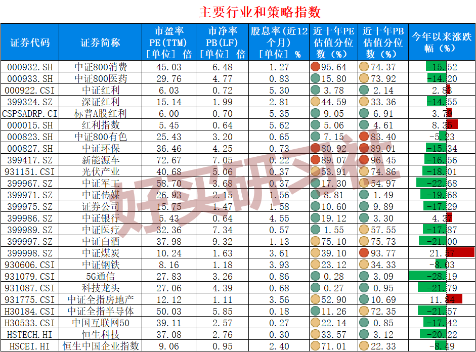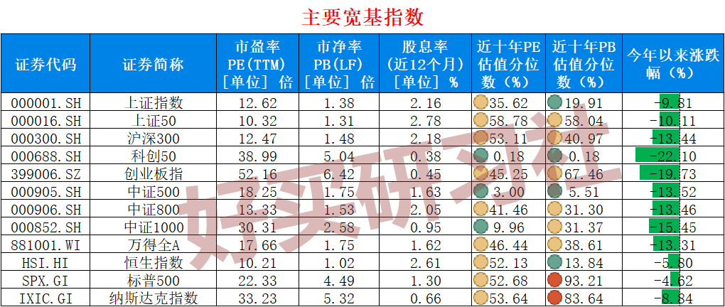 1、近10年PE/PB估值分位数一栏:绿灯,估值百分位<20%,代表低估;黄灯,估值百分位20%~80%,代表中估;红灯,估值百分位>80%,代表高估(指数不满10年的,按基日以来数据统计)。