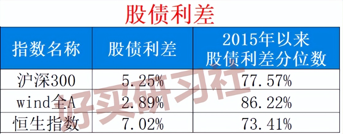 1、股债利差=股票指数市盈率倒数-10年期国债收益率,股债利差越大,代表股票相对债券的性价比越高,则应该加仓股票,降低债券比重。