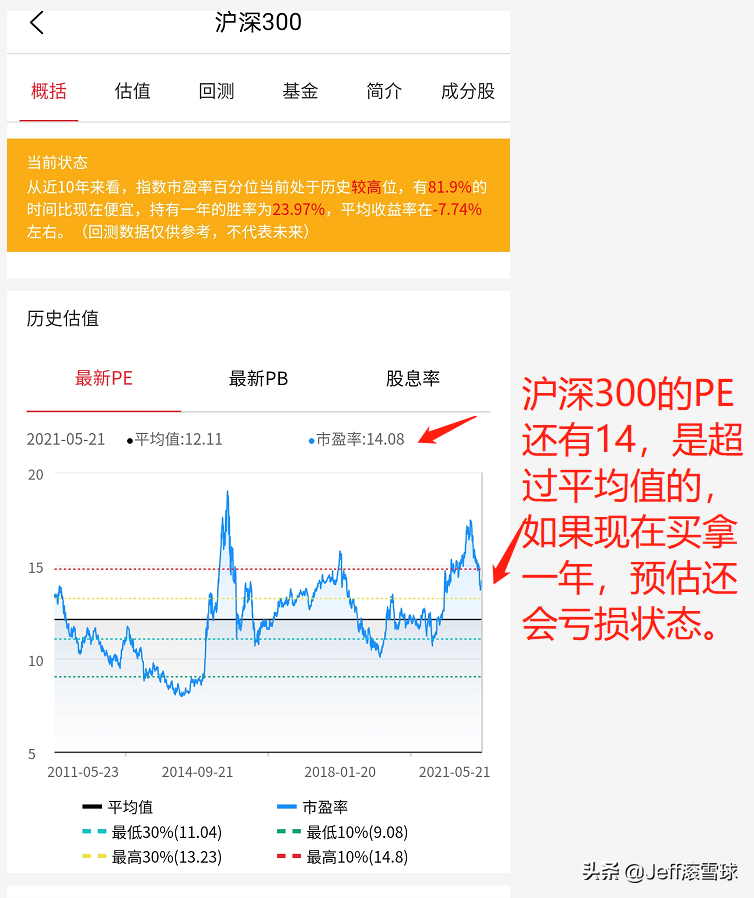 以“沪深300”指数举例(图7),它现在的估值是14,但平均PE是12,依然超过了81.9%的时间,说明这个指数依然风险不低,要谨慎。虽说这个指数回落了不少,但如果现在投,而且能拿住一年,一年后大概率你还是投了个寂寞[笑哭]。