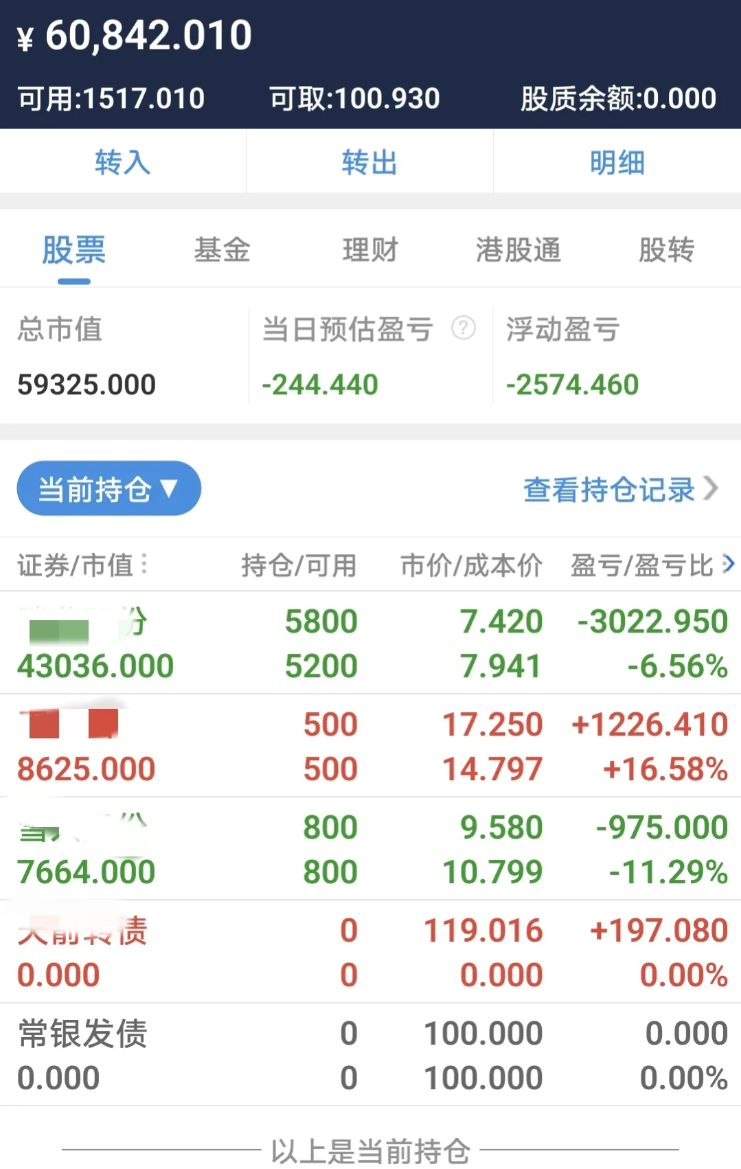 今天行情又不好,亏了244元还能接受吧!重点是6万本金竟然保住了。大盘又继续往下,已形成惯性了。上午最多的时候亏损了1千多元,差一点6万的本金都没有保住,惊出一身冷汗,现在帐户资金少,在亏有点受不了,所以多一分钱也好。