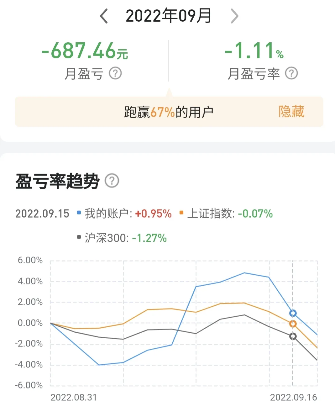 账户里的另外2只股票没有动,玉禾田盈利2000元,连续下跌只剩下1400多元,雪人股份800股,亏了100块钱,这个月没有乱动,亏损少多了,效果还是有的,以后还是尽量玩长线。