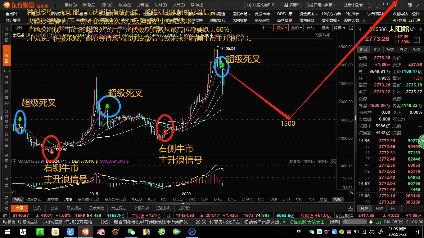 光伏,本质就是熊市反弹,又一批资金被套死!太阳能,光伏板块指数月线,季线刚出现超级死叉信号,大趋势继续 向下,熊市的无数次大小反弹都都小心是诱多。上两次出现牛市后的超级死叉后,光伏板块指数从最高位都要跌去60%,才见底。积极乐观,耐心等待本系统出现底部信号或未来的右侧牛市主升浪信号。