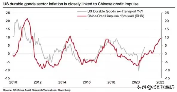 从图中可以明显看出,只要中国的信贷脉冲指数飙升,一般几个月后,美国的耐用品价格也会开始拉升。