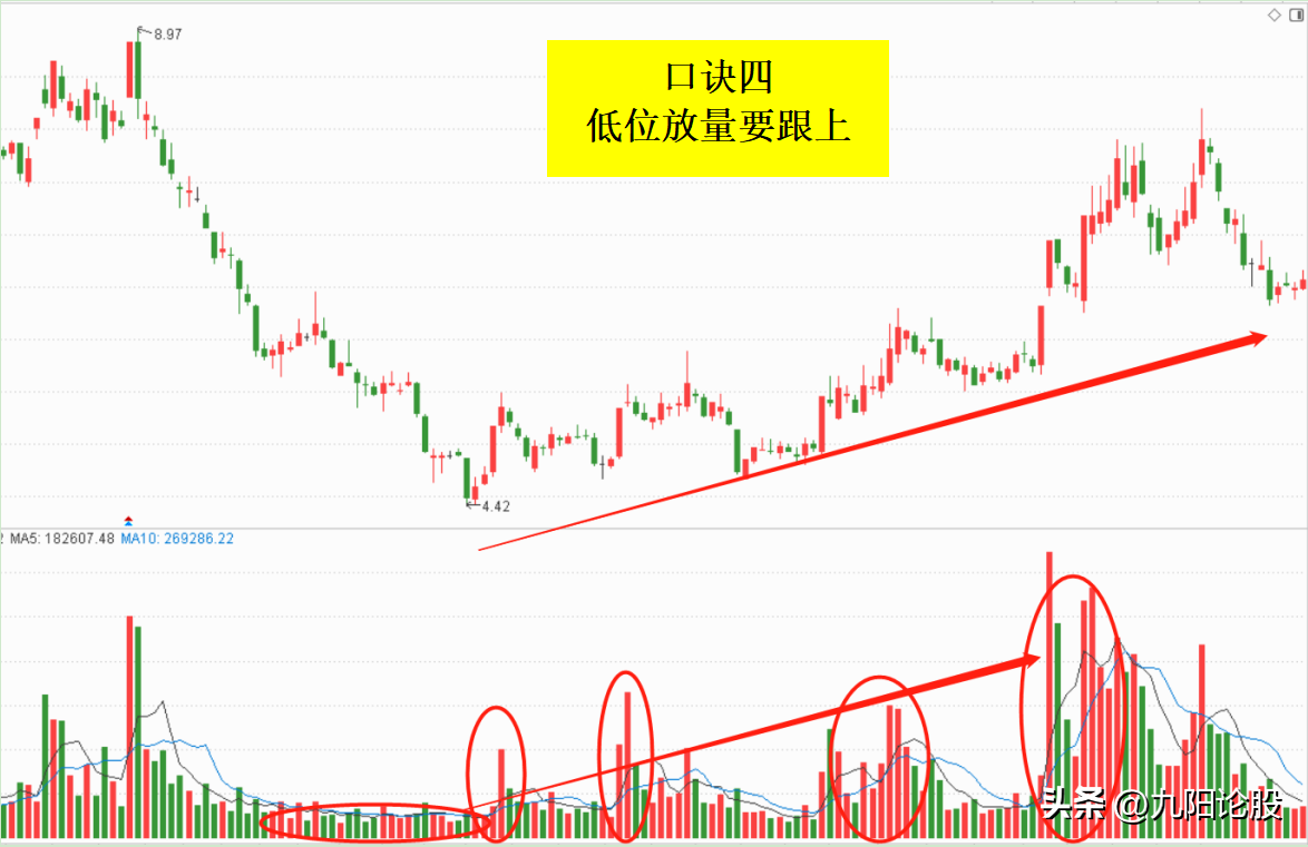 4,低位放量要跟上。低位放量说明有主力进场,无论他是吸筹还是主升。跟着大鱼吃小鱼,大概率会吃肉。