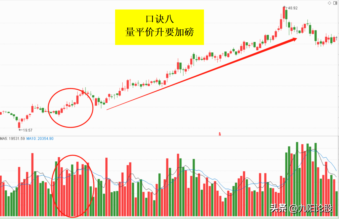 8,量平价升要加磅。放量价升就是多头正常进攻,平量价升就是多头强势的进攻。前者需要不断使用更大的力气才能向上推,后者轻松就能搞定。说明筹码都在主力手中,平量就能正常进攻。此时,不加磅更待何时?