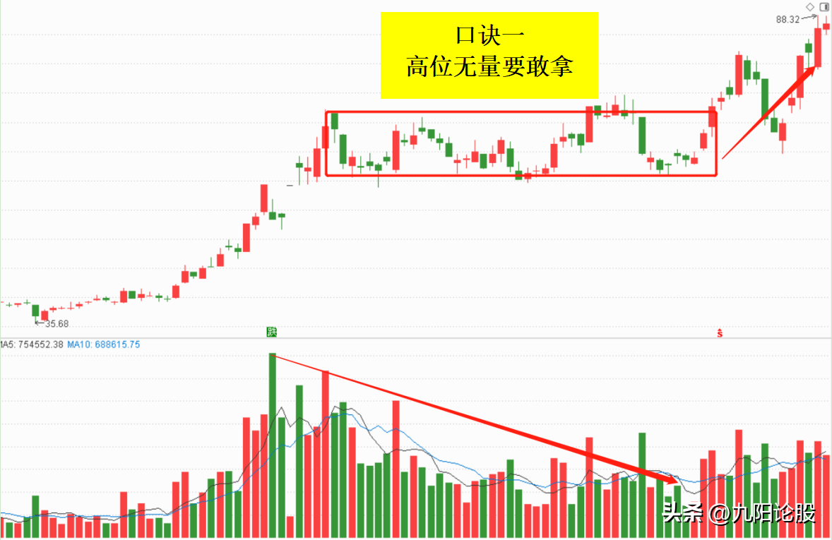 1,高位无量要敢拿。高位不放量,安全有保障。股价处于高位,成交量不放大。代表主力还未出逃,市场分歧小。经过一段时间的清洗浮筹后,往往后面还会创出新高。