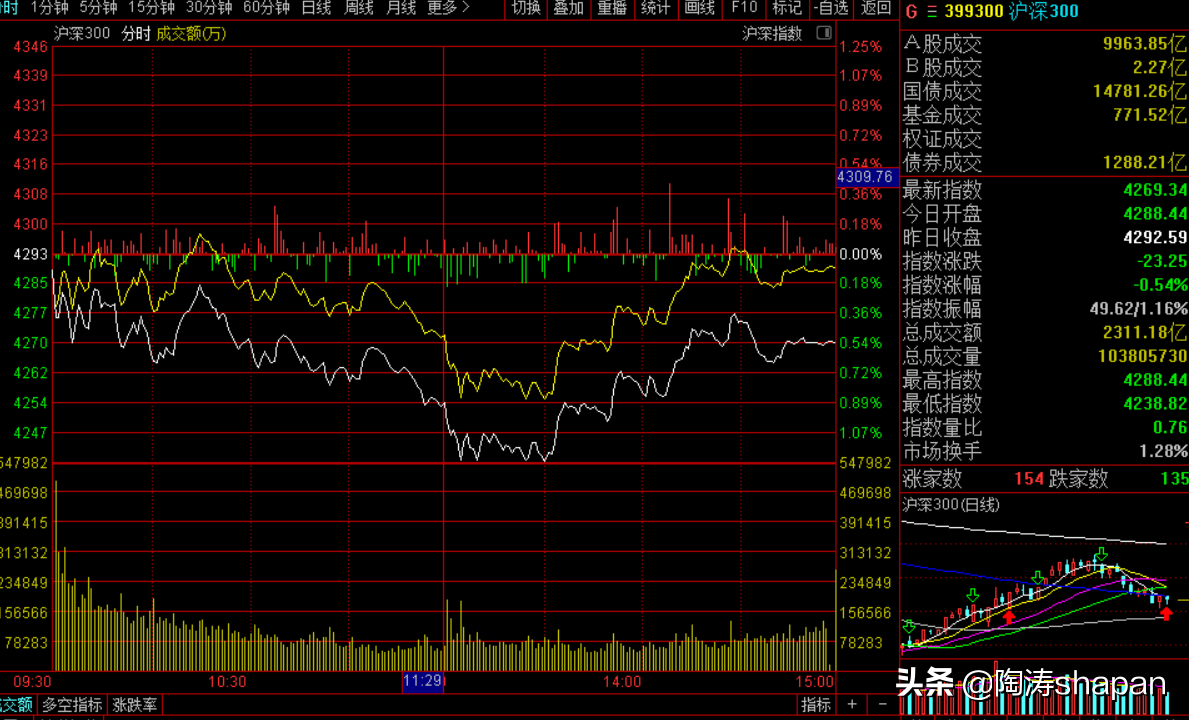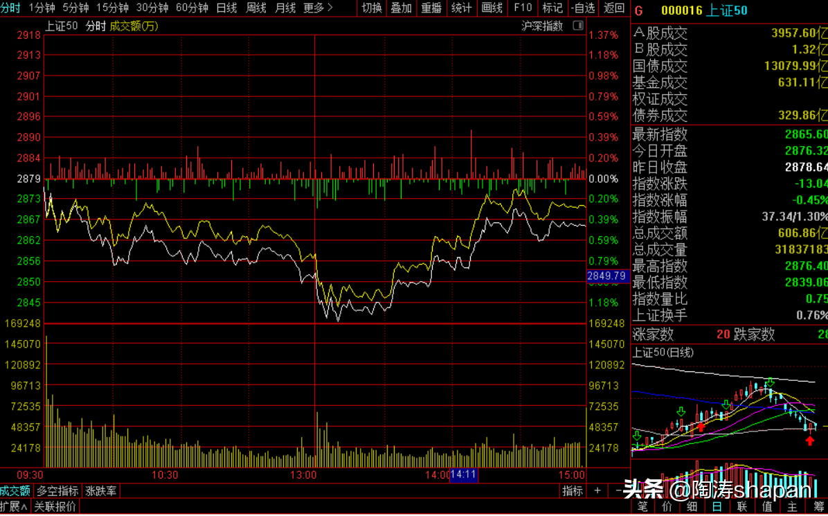 比如今天,下面图一和图二,上证50指数和沪深300指数都是阴线,收盘低于昨天。