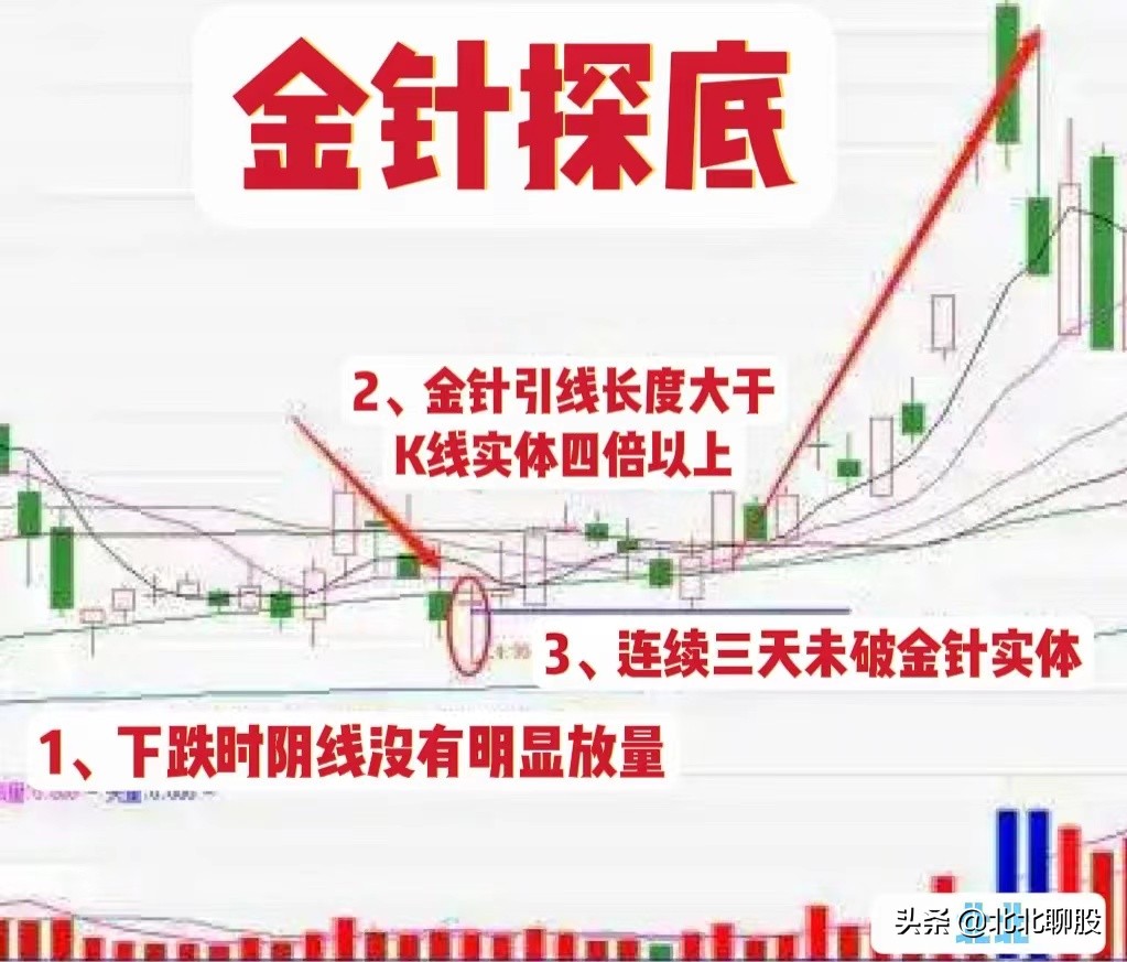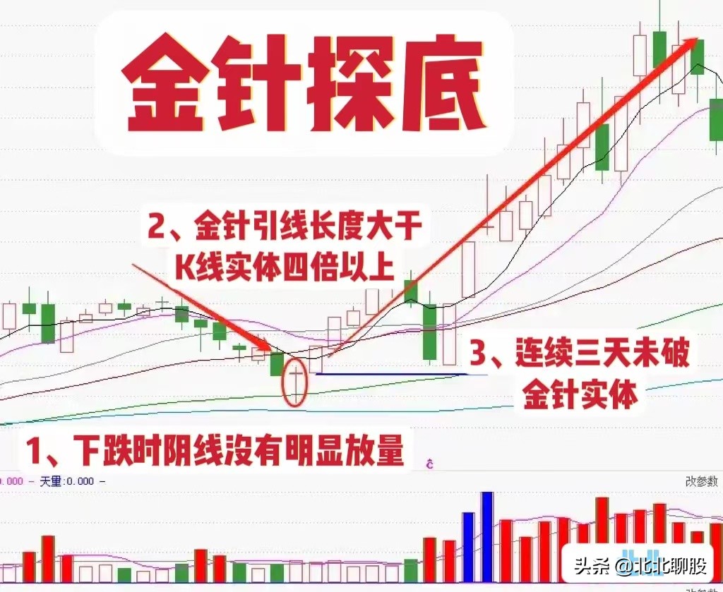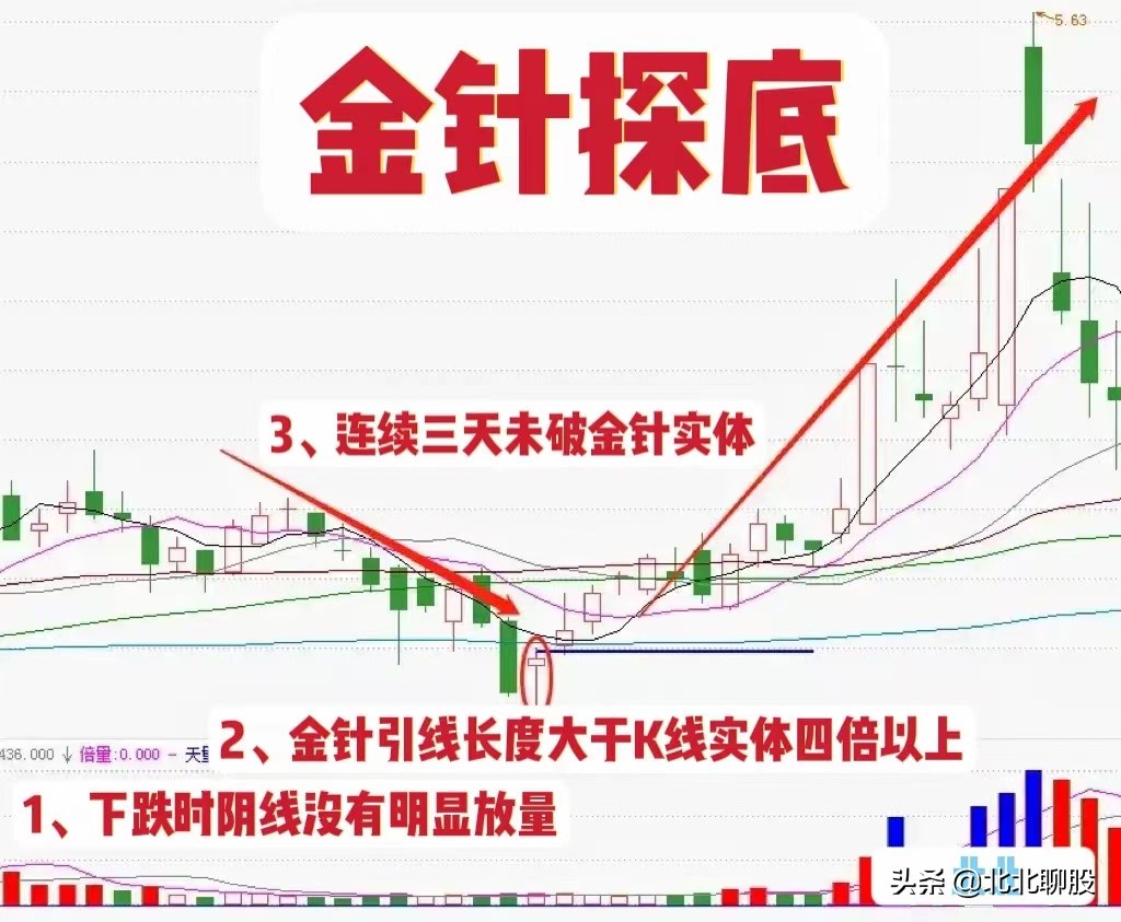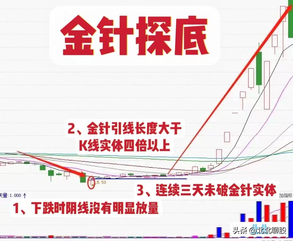 3、确认信号:金针出现之后连续三天都没有跌破K线实体,是金针探底形态形成的信号,伴随不断放量,之后会开始主升浪行情。