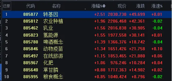 一、今日复盘:大盘指数以小阴收盘,前10板块如图1,32个概念板块收阳,农业概念持续上涨。