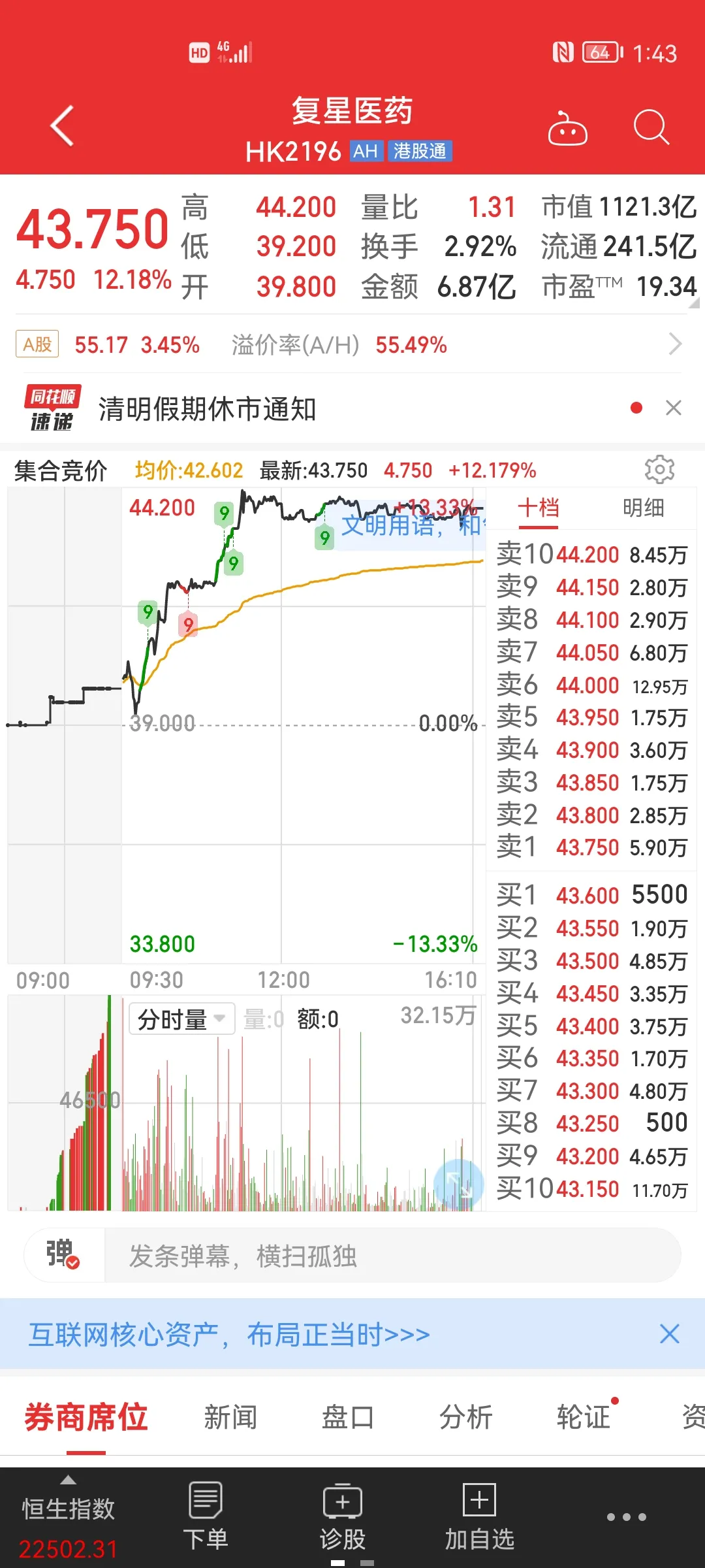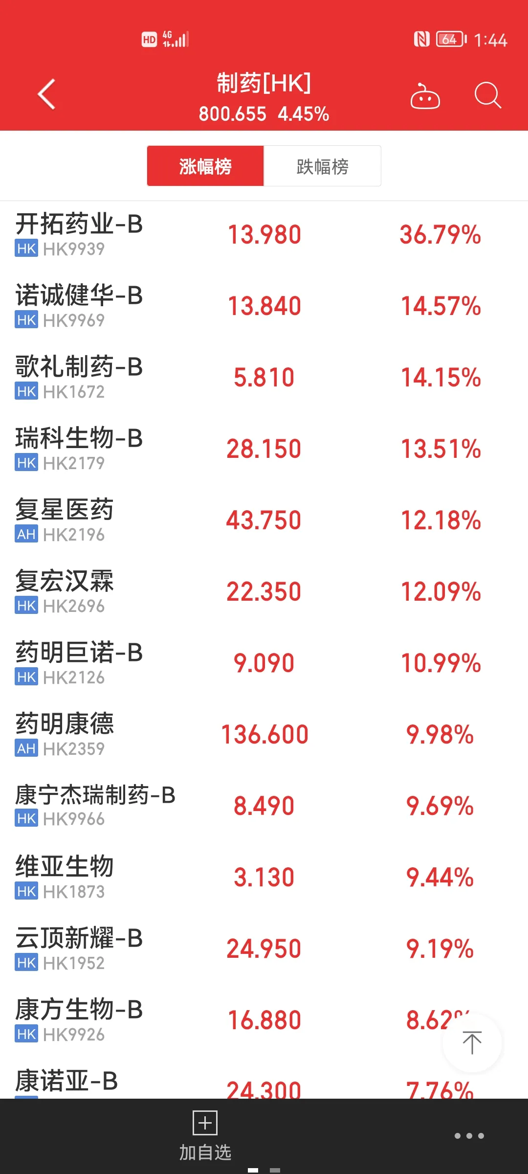 港股医药大涨,开拓药业甚至大涨36.79%,复星医药大涨12.18%;