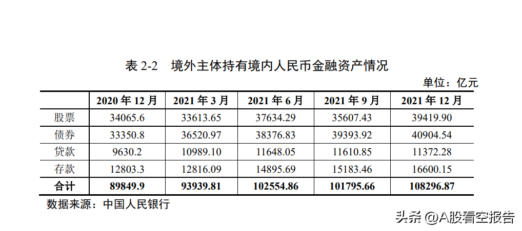 2、截至2021年末,境外主体持有境内人民币股票、 债券、贷款及存款等金融资产金额合计为10.83万亿元,同比增长 20.5%。