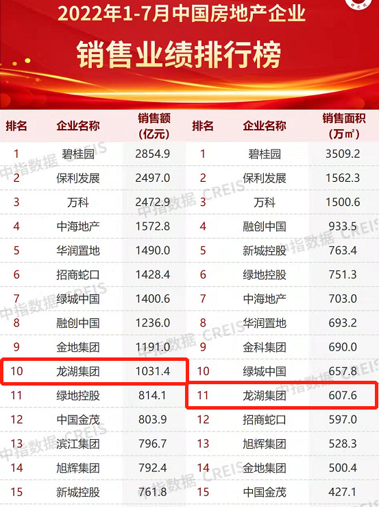 据中指院数据显示,今年1-7月,龙湖实现总销售金额1031.4亿元,排名第10,是仅有的10家千亿房企之一;