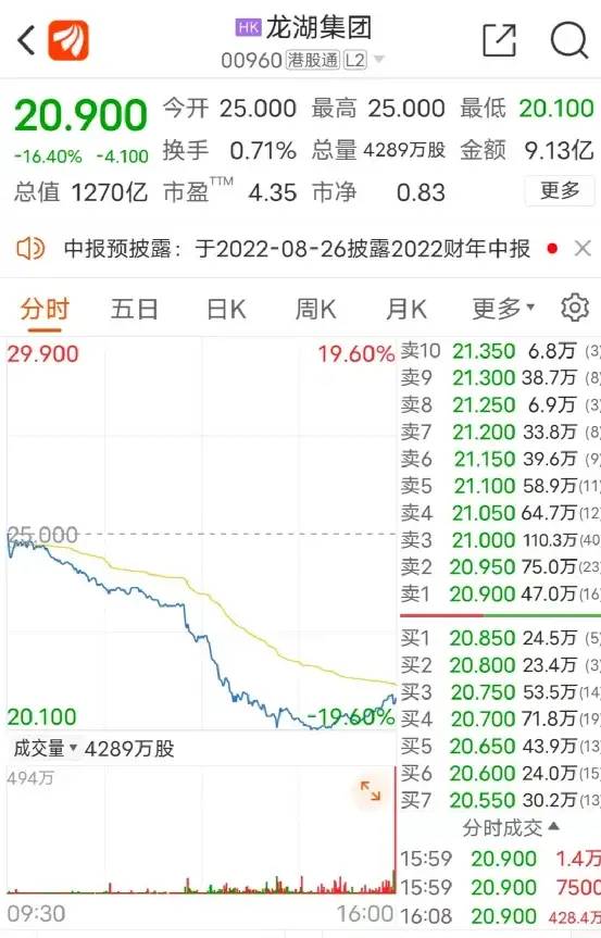 一夜风波后,龙湖今日开盘走高,盘中最高涨11.0%。截至收盘,龙湖股价达22.1港元,涨幅为5.7%。