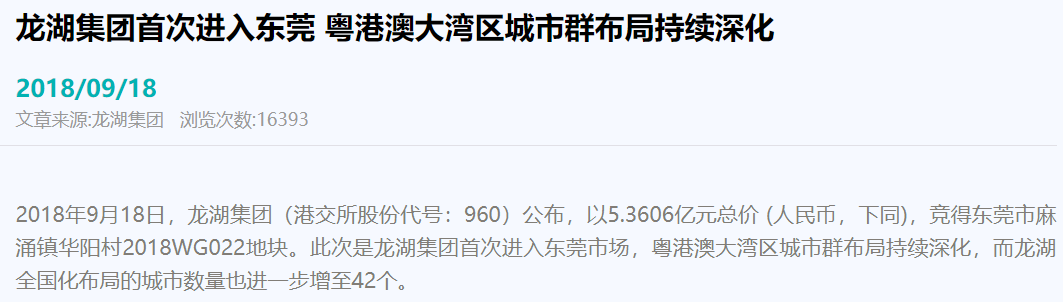 2018年9月,龙湖首次以招拍挂的方式进入东莞,以5.36亿元的总价,拿下麻涌一宗仅约2.95万平的商住用地,折合楼面价约5200元/平。