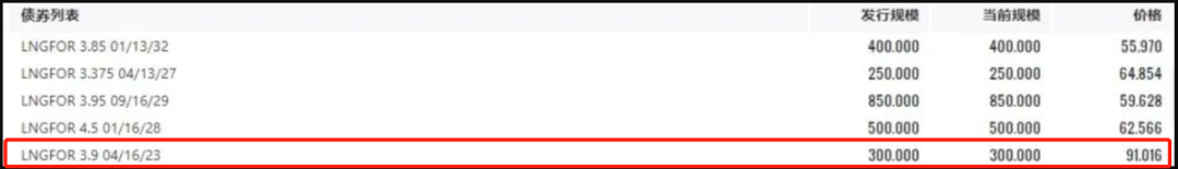 美元票据也受到相应影响,跌势最猛的“LNGFOR 3.85 01/13/32”,短时从1美元面值57美分上方跌至54美分,瞬时跌幅超过5%。