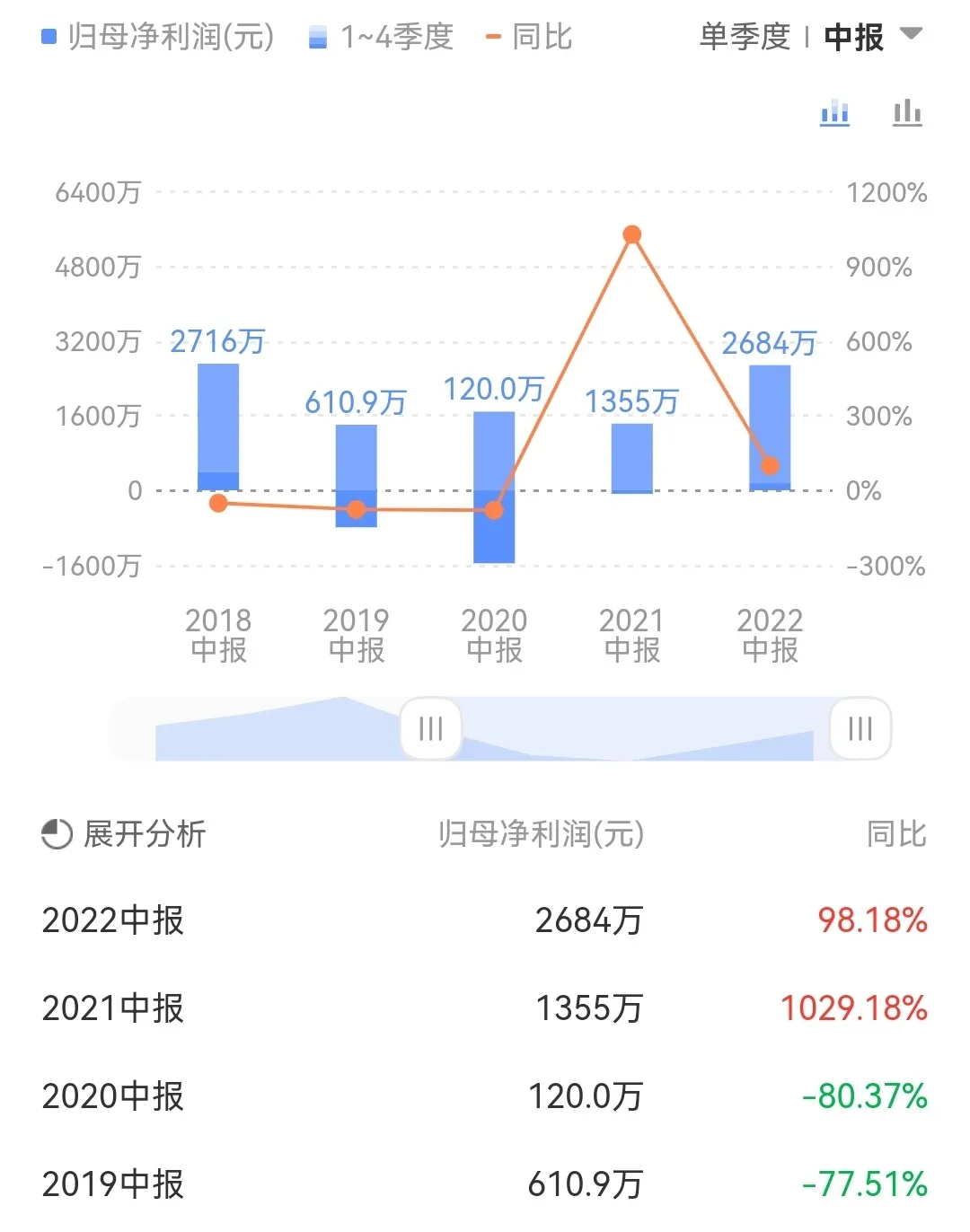 2019-2022年半年报净利润分别是610.9万,120万,1355万,2684.3万。8月24日披露2022年半年度报告数据显示,2022年上半年,公司实现营业总收入5.01亿元,同比增长26.07%;归母净利润2684.3万元,同比增长98.18%;扣非净利润2112.78万元,同比增长36.78%。