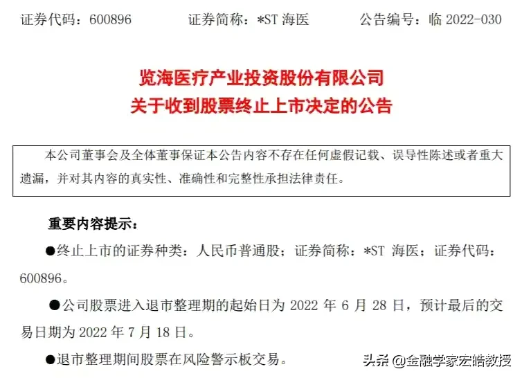6月20日晚,*ST海医披露公告称,公司收到股票终止上市决定,公司股票进入退市整理期的起始日为6月28日,预计最后的交易日期为7月18日。