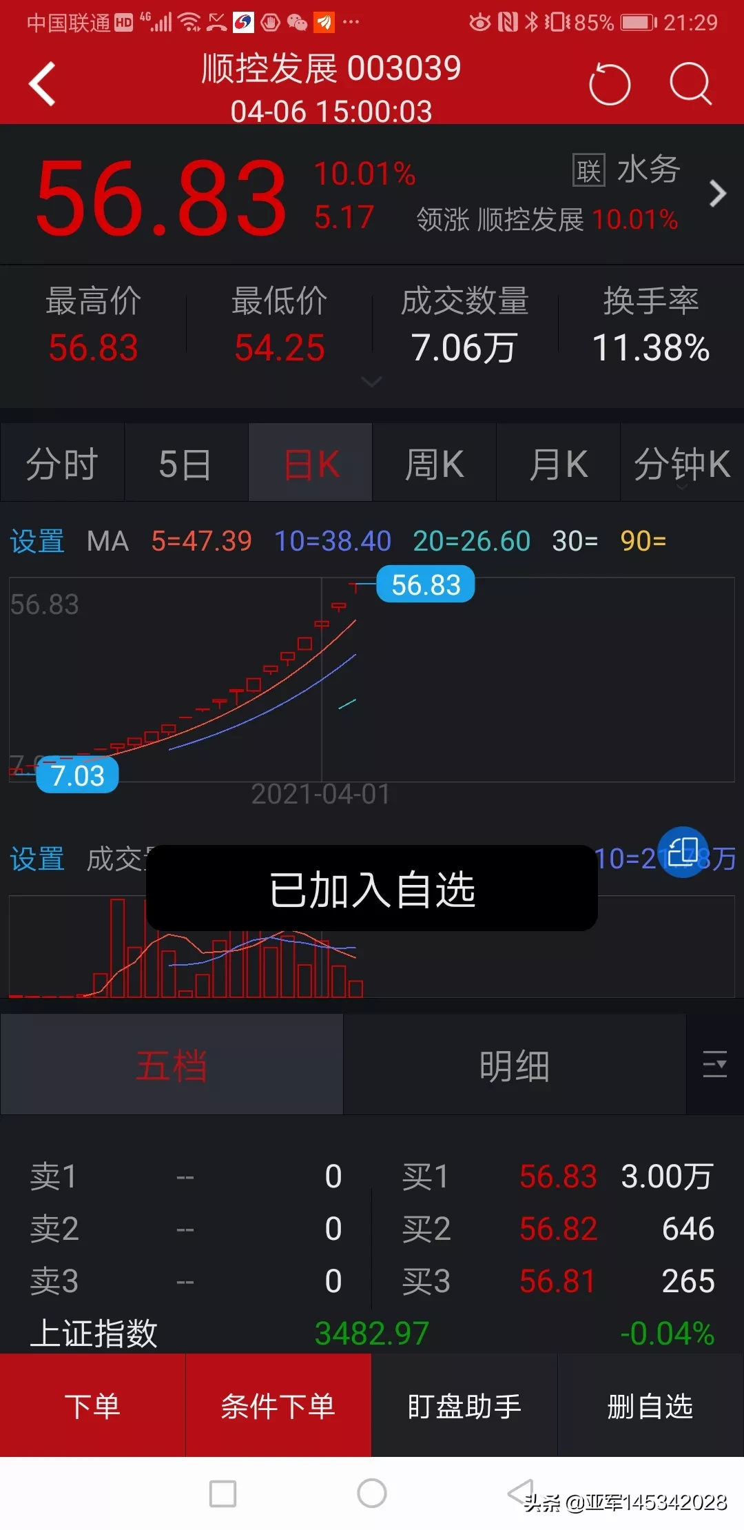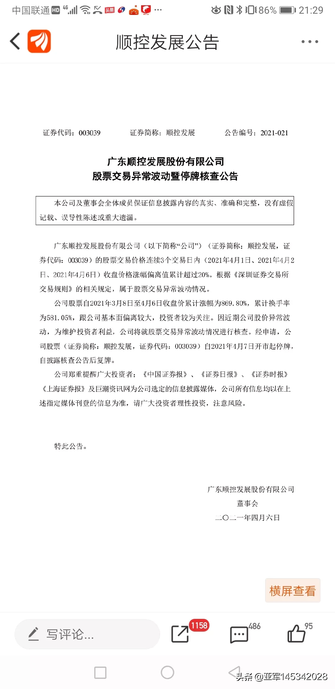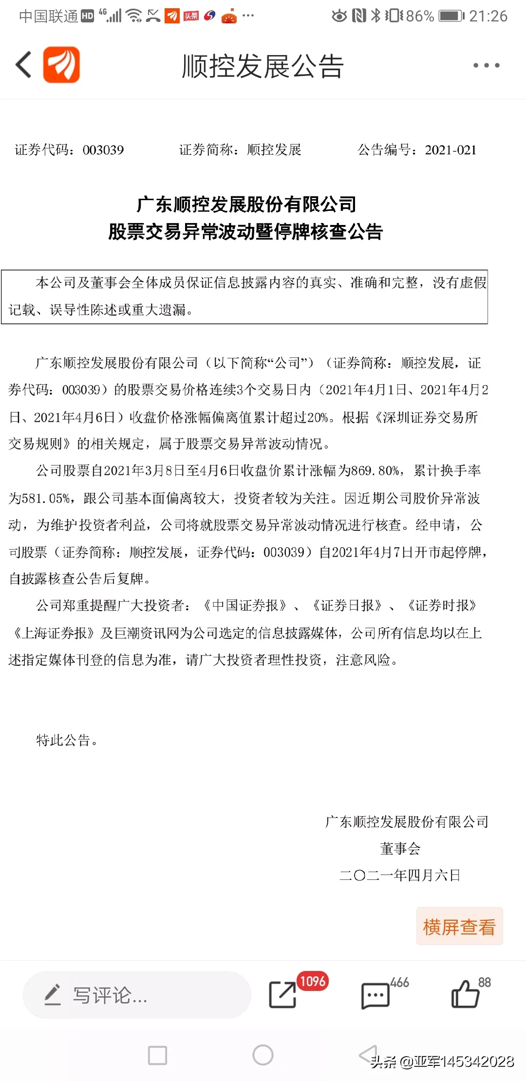 今天收盘后,牛年第一妖股顺控发展发布公告,由于自3月8日至4月6日股价上涨了869.80%,累计换手率581%,跟公司基本面偏离较大……为维护投资者利益,经申请,自4月7日起停牌,侍自查公告后再复牌。