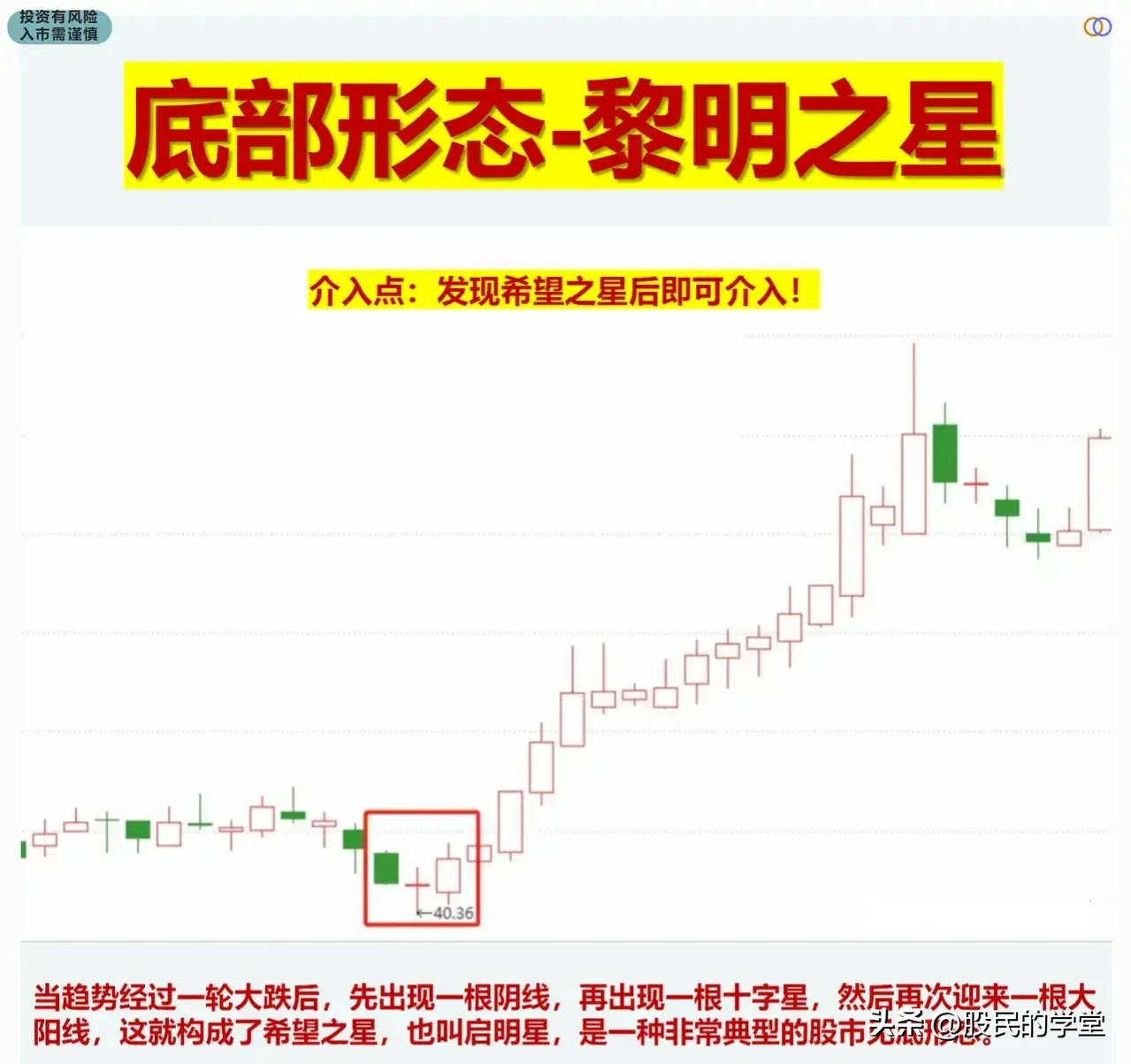 通常有两种情况可形成底部:一种是由市场自然交易过程形成的底部,另一种是由庄家配合利空消息刻意打压形成的。形态来讲,小型底部有早晨之星、母子线、穿头破脚等,大型底部结构有V形底、双底、头肩底、平台底等。