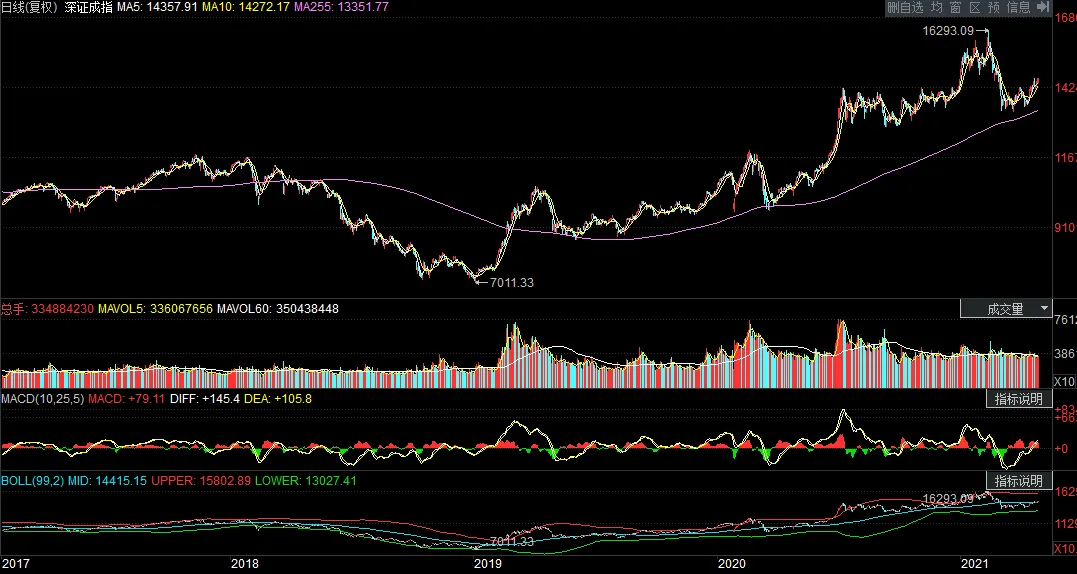 3、关于看盘软件主页面设置。我一般是选择上方是k线,然后用5日、10日和250日的均线,下面是成交量,然后用5日和60日均量线,在下面就是macd和boll。Macd的话我是指标参数改为(10、25、5),这样能更及时反应,boll的话,我的指标参数是选择(99、2),这个用来判断股票走势也是很不错的,如果跌破中轴线说明转弱了,站上中轴线则是转强,站在上方有可能短线要有爆发了。大家可以试试看,验证下。