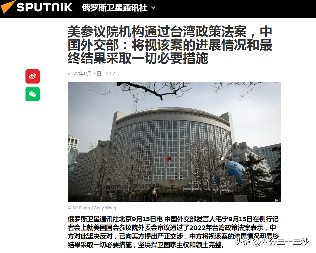 第三个消息,据俄罗斯卫星通讯社9月15日的报道,美国参议院外委会在14日通过了所谓“台湾政策法案”,接下来将提交全会进行审理。面对美方又一次挑衅,我外交部发言人毛宁在15的例行记者会上就表示,中方将采取一切行动捍卫国家主权与领土完整。
