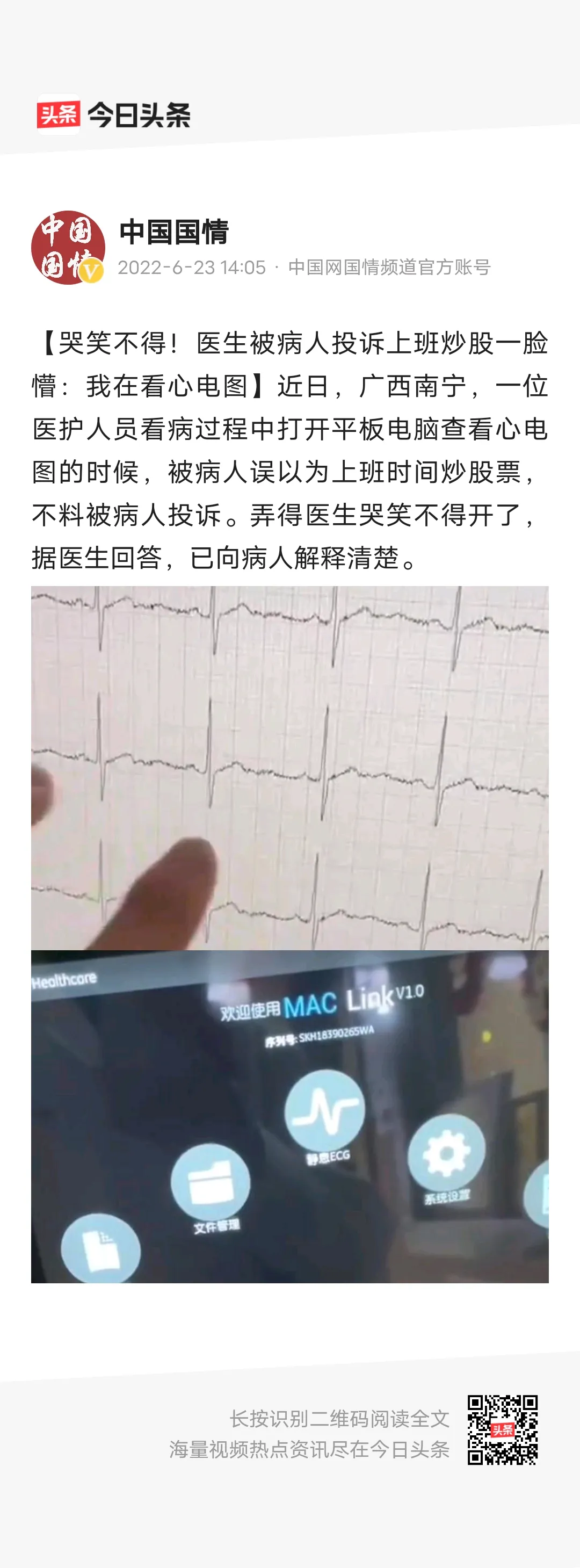 “我看的是心电脑不是k线图。。”近日广西发生了件让人哭笑不得的事,一名医生打开平板电脑,被病人看到误以为他上班炒股,当即投诉了医生。