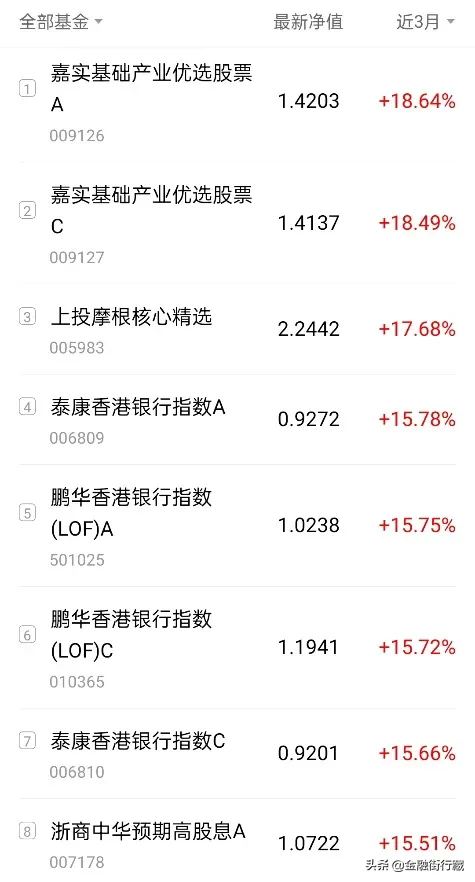 点进去之后就能看到近三个月某类基金的排名情况,一般来说参与排名的有很多主题型基金,这些基金可以不用看,因为往往是某一个阶段表现较好,后面就萎了,比如说最近三个月表现好的主要就是香港银行指数,以及一些高股息策略基金。