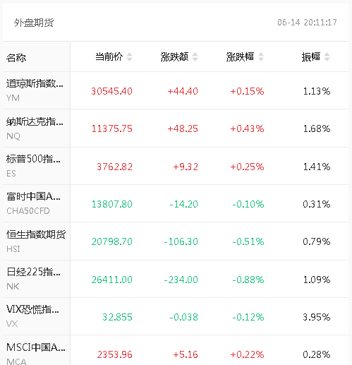 美国股指期货小涨,其中纳斯达克指数小涨0.40%,道琼斯指数小涨0.14%,如下图。