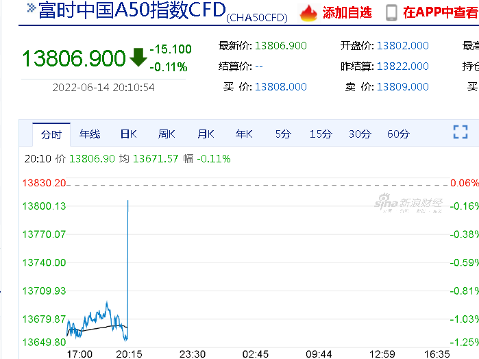 截至20点15分,富时中国A50指数CFD小跌0.11,看下图。