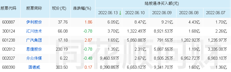 北上资金连续5天净买入,且每天净买入大于5000万元股票有6支, 如下图。