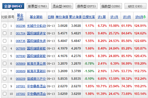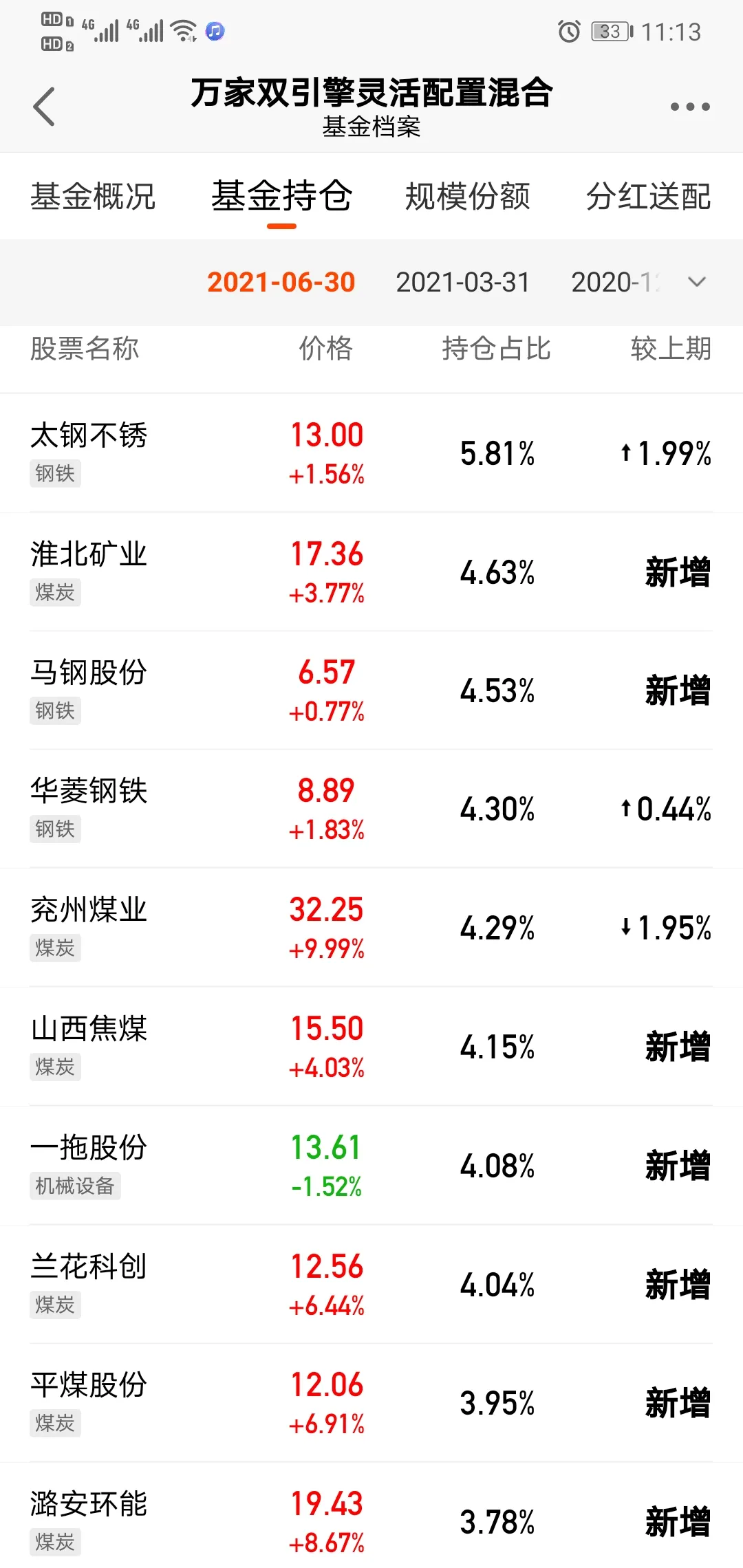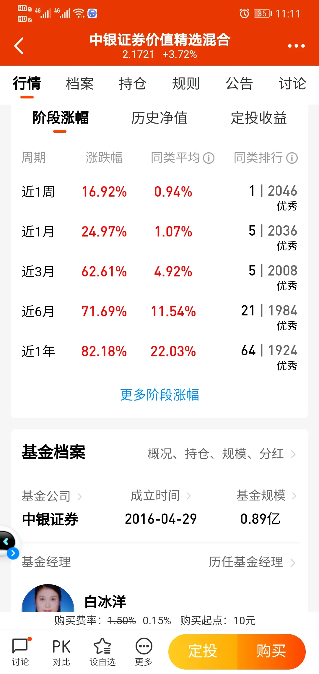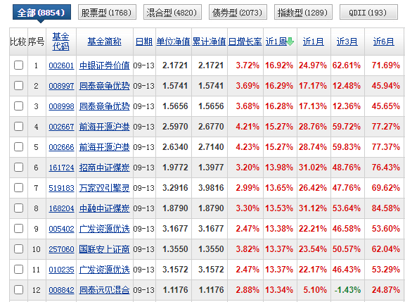 近1周的收益冠军不用我说,大家也知道,那就是我经常说的那个挂羊头,卖狗肉的中银证券价值,周收益率16.92%,尽管它的名字有证券两个字,实际上和证券完全不相干,大概两周前我就在群里推荐,今天表现依然强势稳定,所以我毫不犹豫的拥有了。我的第一重仓前海开源创新成长,周排名第三,周收益率15.27%,目前是我的第一重仓,光伏的钱绝大多数买了它。当然煤炭和钢铁的混合基万家双引擎也非常不错,不想单独买煤炭和钢铁的,买它一支就够了。